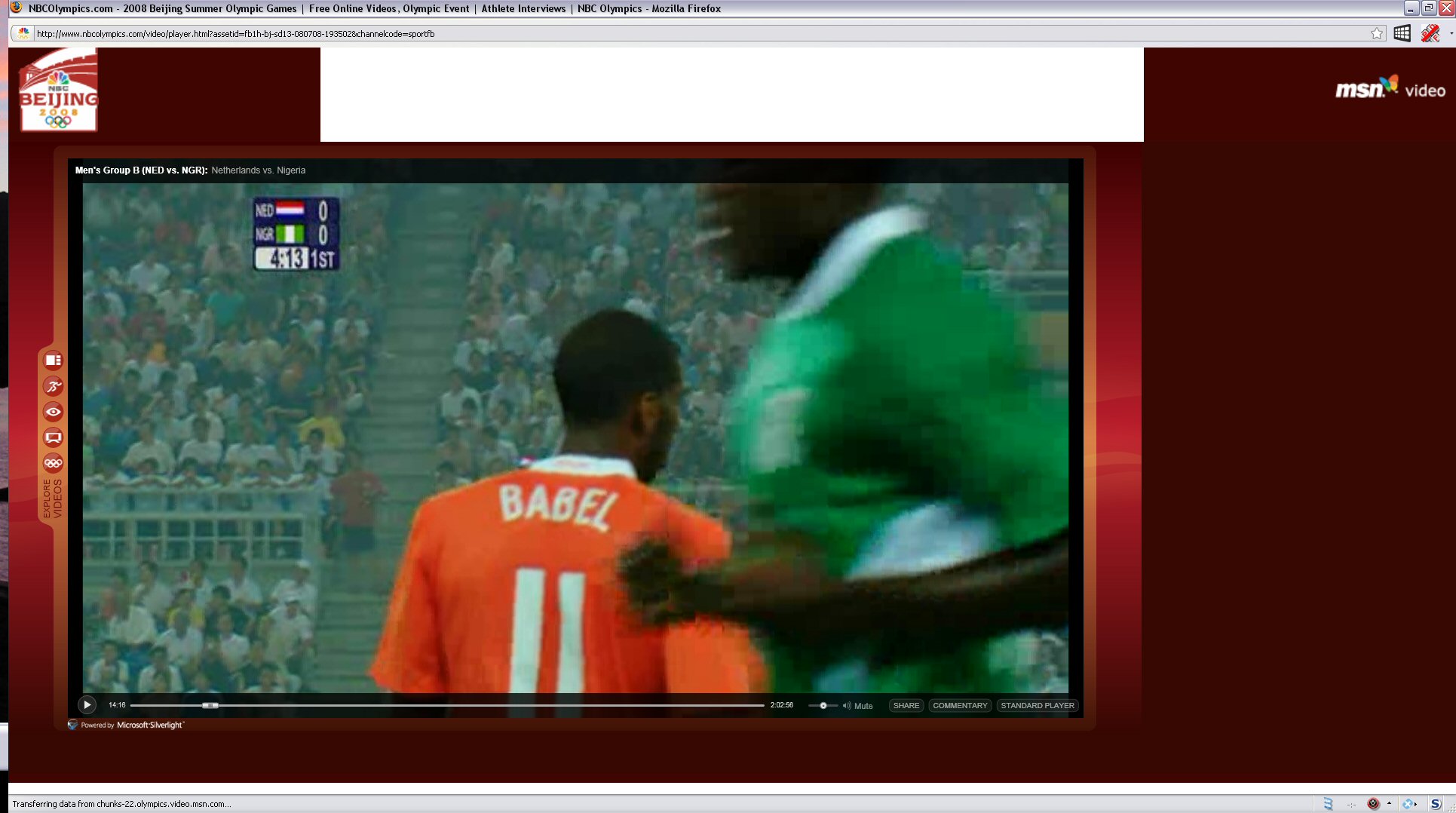 The promise of internet video on demand seems to be close to fulfillment. So far, it seems that various events are available to view “on demand, on line” (OK, so far, only soccer games, but what else is so important besides bike racing?) at my convenience. And note, I enjoyed watching the Dutch play Nigeria without a voice over announcing what I could see for myself, and without promo and popup adds. It seems that nbc has put the raw feeds from the venues on their web site ( http://www.nbcolympics.com/video/index.html ) for your enjoyment. Check it out.